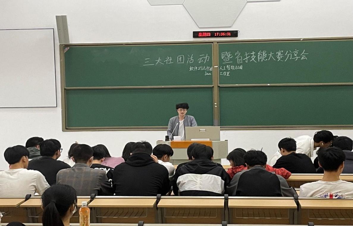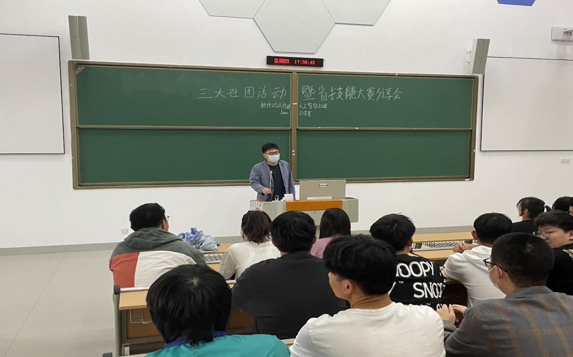 2022年6月2日晚18点教3-309教室,智能工程学院Java工作室、软件测试社团以及人工智能社团联合举办技能大赛分享会。本次活动由Java工作室社长王海鹏主持,主题是以往参赛同学们分享备赛、参赛心得和感想,为2023年省技能大赛积累经验,约40名社团成员与指导老师王鹏飞共同参加。