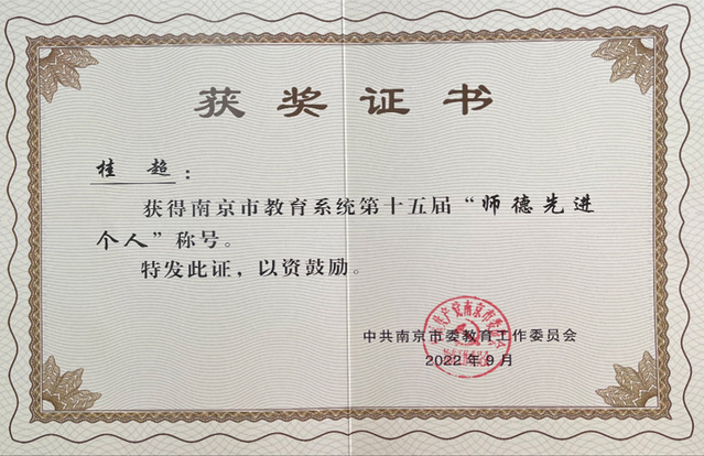 近日,南京市教育局公布了南京市教育系统第十五届师德先进集体和师德先进个人评选结果。我校思政教学部思政教学创新团队被授予 “师德先进集体”称号;智能工程学院桂超老师被授予南京市教育系统第十五届“师德先进个人”称号。